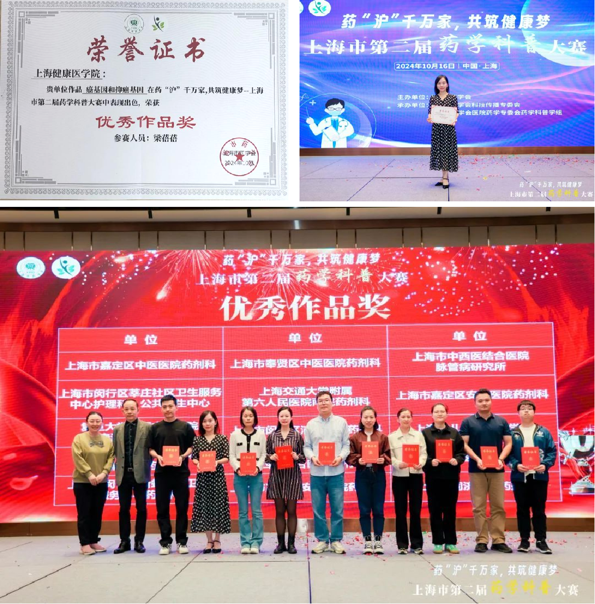 2024年10月16日,由上海市药学会主办,上海市药学会科技传播专委会和上海市药学会医院药学专委会药学科普学组共同承办的药“沪”千万家,共筑健康梦——上海市第二届药学科普大赛决赛顺利举办。我院微生物与生化药学教研室梁蓓蓓老师积极参与,认真备赛,以作品“癌基因和抑癌基因”获得大赛“优秀作品奖”。此次为我院教师首次参与上海市药学科普大赛,与来自沪上各大医院,高校及科研院所的一百多项药学科普作品共同角逐,最终在激烈竞争中脱颖而出,入围优秀作品,科普能力得到了组委会的一致认可与好评。