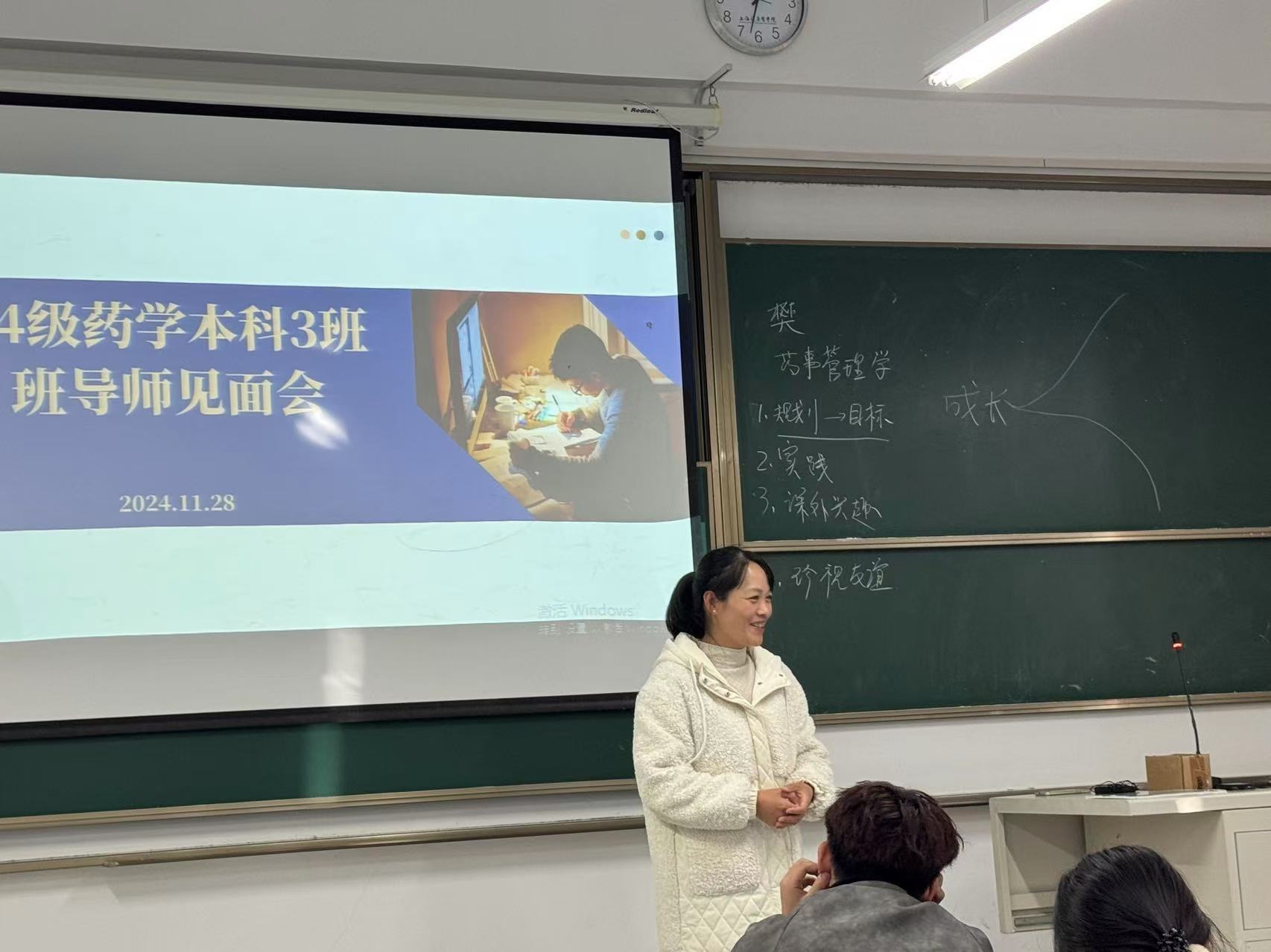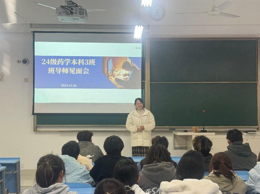 2024年11月28日下午1点,beat365体育亚洲官方网站2024级药学本科3班在南苑E104教室举行了本学期第一次校内班导师见面会,本科班导师樊玉录、辅导员袁恺文参加本次见面会。药事管理专业樊玉录老师从自身的专业视野出发向2024级药学本科3班的同学们介绍了药事管理学这门学科,并结合自身学业成长经历,对同学们未来的规划进行指导。