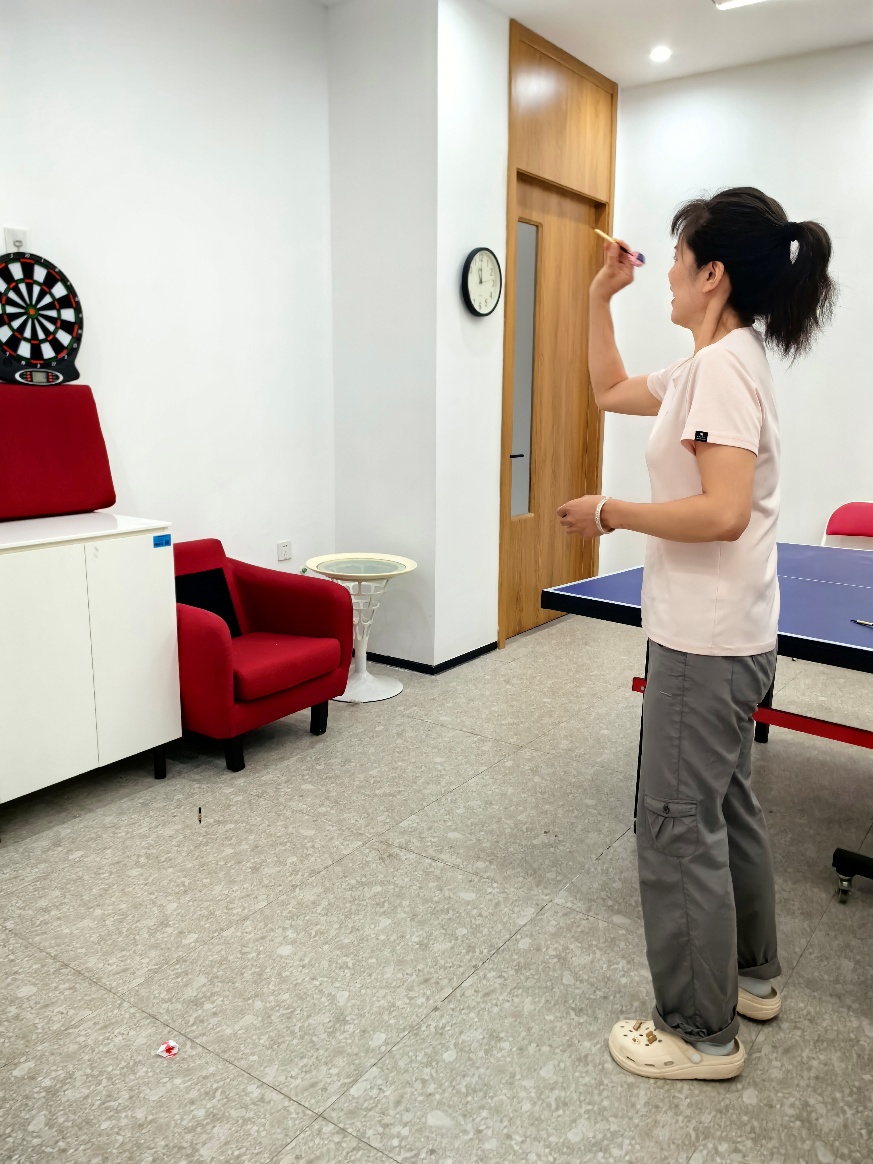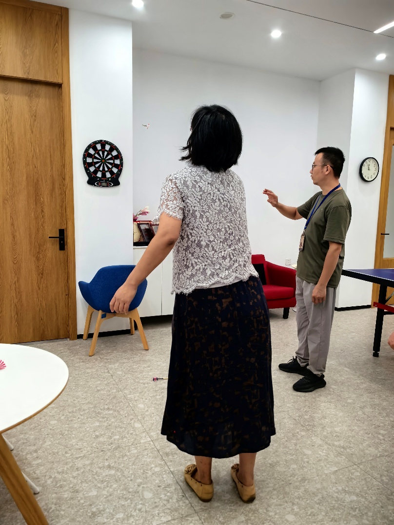 为了能够让更多老师有机会参与活动,工会分别于9月30日、10月10日两个时间段进行。活动现场,气氛热烈。老师们手持飞镖,眼神专注,瞄准靶心奋力投掷。每一次飞镖的飞出,都伴随着周围同事的加油与喝彩。有的老师凭借精准的技巧,屡屡命中高分区域,在阵阵叫好声中,笑容格外灿烂;有的老师虽初试身手,但气定神闲,不断调整姿势,力求突破自我。即便是几次脱靶,依然热情高涨,莞尔一笑。