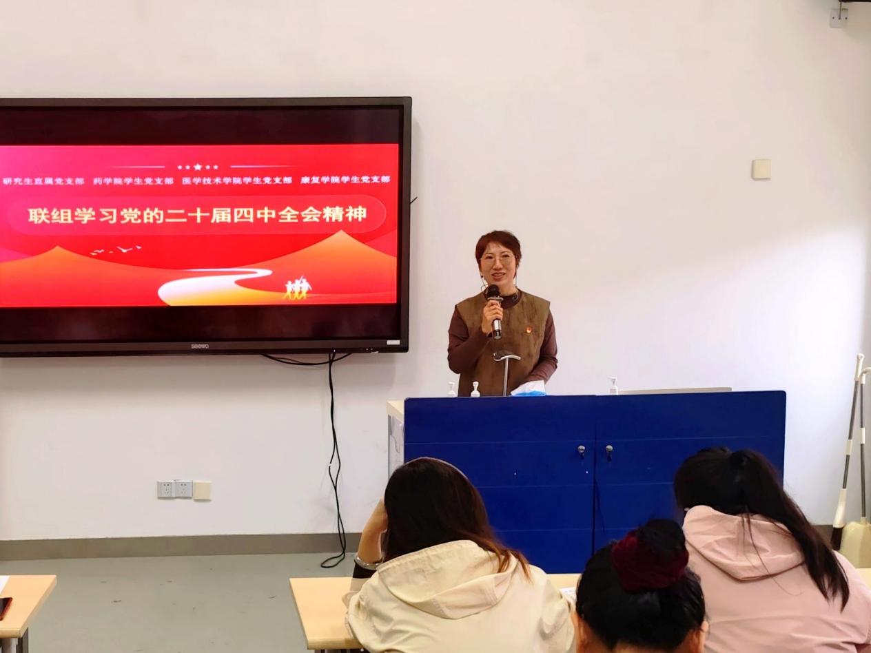 11月6日,beat365官网研究生直属党支部、beat365体育亚洲官方网站学生党支部、医学技术学院学生党支部和康复学院学生党支部师生共同围绕“深入学习党的二十届四中全会精神”开展了联组学习。会议由研究生直属党支部书记蒋瑛英主持。